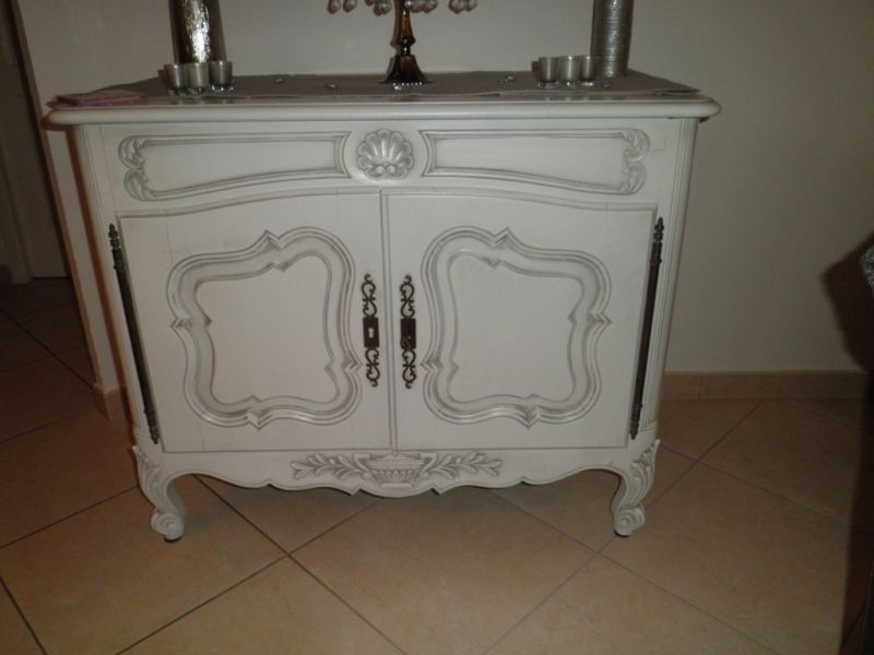 Ce magnifique petit bahut en noyer de style provençal à été relooké en blanc patiné gris pour le rendre plus contemporain.