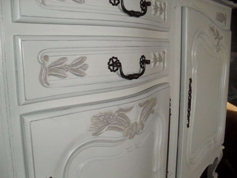 Ce bahut ancien en noyer style provençal a été relooké avec une couleur ivoire et d'un rechampi couleur lin essuyé.