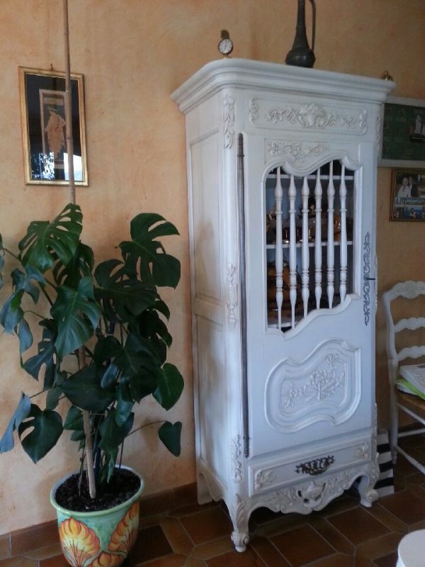 Ce meuble de famille a été complètement décapé par aérogommage, poncé, puis repeint en blanc patine noisette.