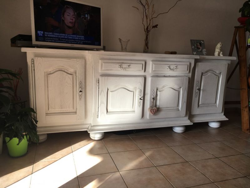 Une toute nouvelle décoration pour ce buffet ancien campagnard en bois vernis, celui-ci a été décapé puis patiné avec une finition blanche pour lui apporter de la luminosité et de la modernité.