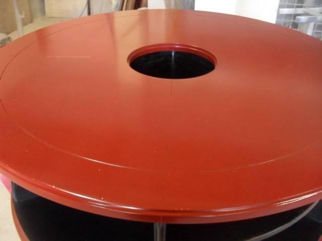 Cette tablebasse en merisier à été entièrement poncée à la main et repeinte (plateau et socle) de couleur "orange sanguine" sans patine pour plus de modernité.