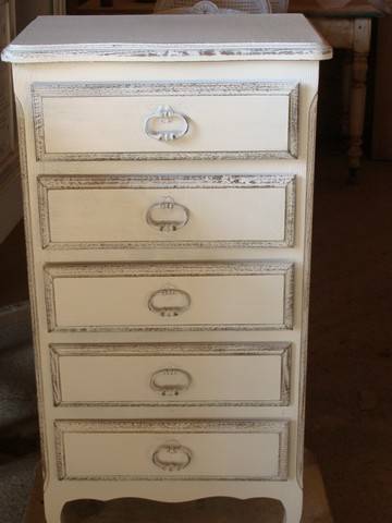 Chiffonnier ancien qui était de couleur teinte bois (chêne moyen), que l'on a relooké que qu'il puisse d'adapter aux intérieurs d'aujourd'hui grâce à sa nouvelle couleur : blanc et gris patiné.