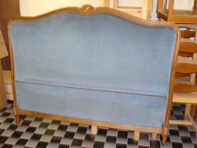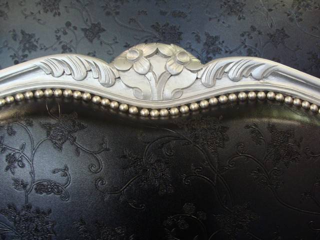 Ce lit corbeille a été décapé puis repeint avec une peinture couleur argent, il a été ensuite retapissé avec un tissu de couleur noir pour un style très baroque.