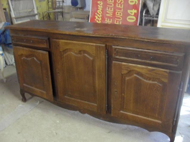 Ce bahut en chêne style provençal a été décapé puis repeint avec des couleurs tendances: le corps du meuble est de couleur lin avec patine blanche et le plateau est couleur crème patiné couleur lin.
