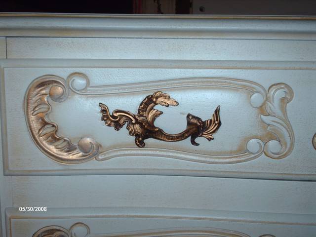 Décapage et mise en peinture d'une commodeancienne style louisXV, cette commode a été décapée par sablage et peinte en gris clair, avec le petit plus: la dorure sur les poignées.