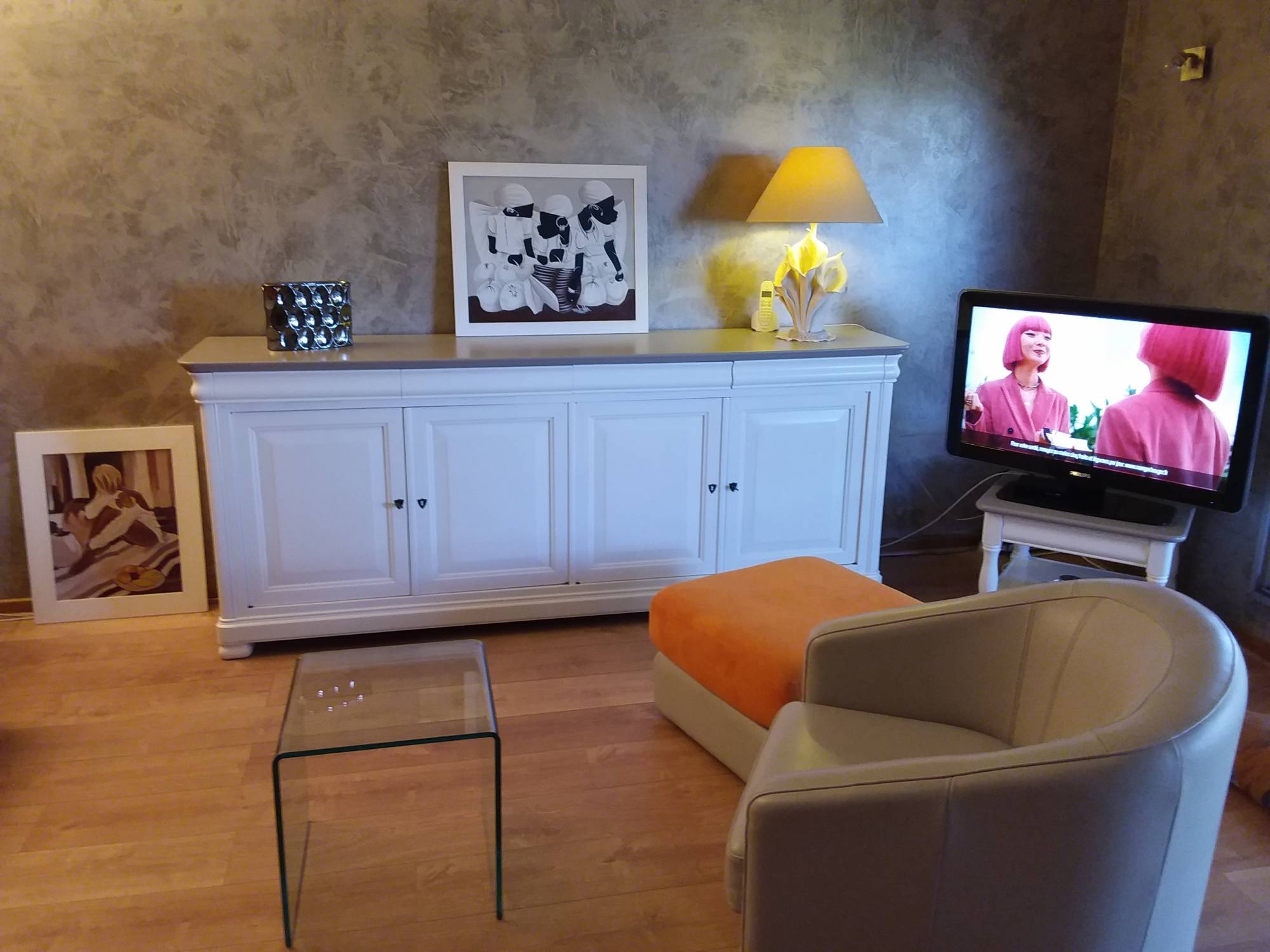 Un nouveau look pour ce buffet ancien en merisier de style Louis Philippe, en 2 couleurs pour plus de contraste, blanc cassé pour le corps du meuble, et taupe pour le plateau, pour faire un rappel de couleur avec le mur récemment repeint...