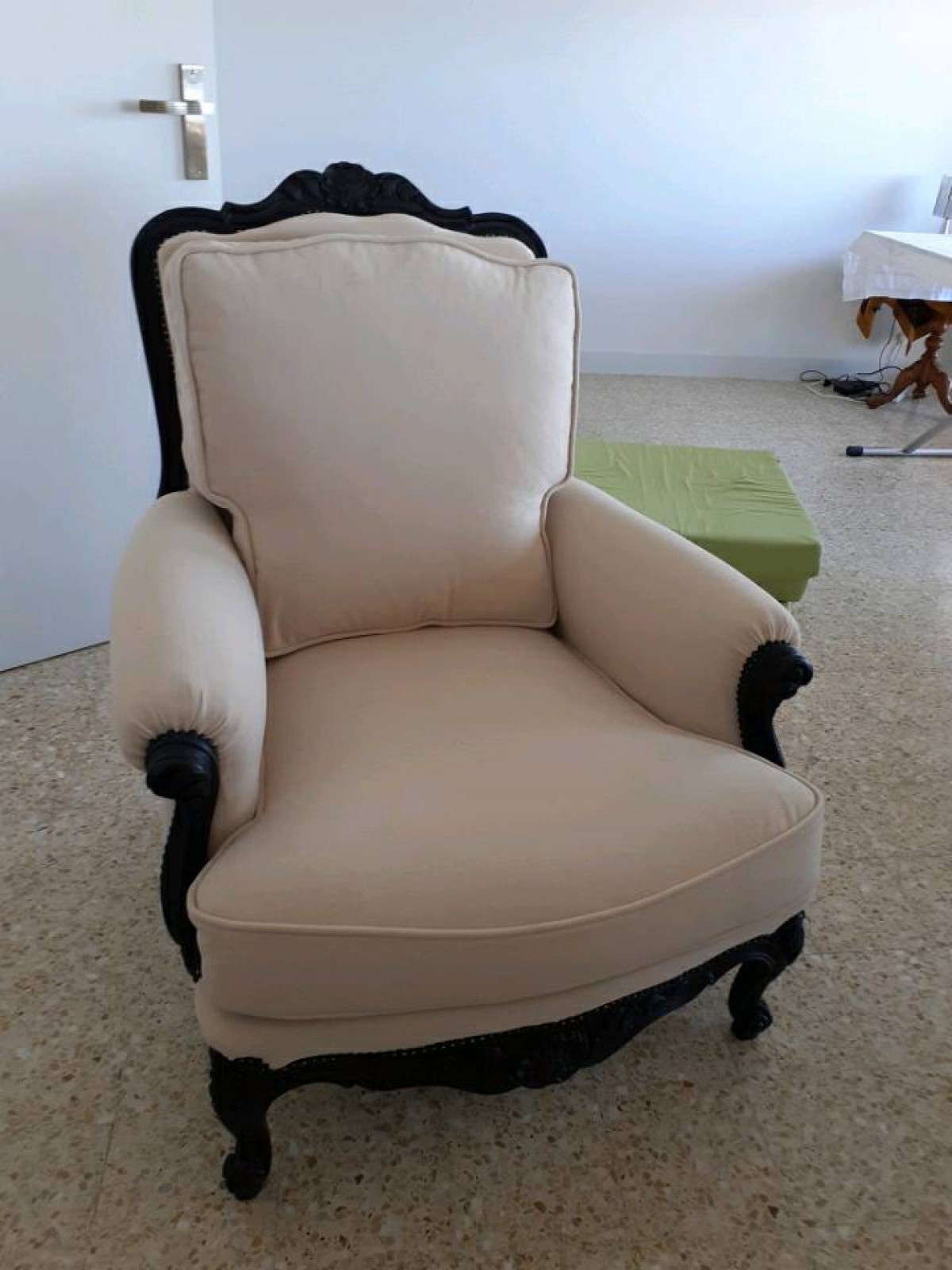 Voici donc le relooking de ce fauteuil de type bergère qui a donc été décapée puis repeinte en noir mat. Le tissu a été changé pour être remplacé par un tissu de couleur ivoire beige de la marque Casal.