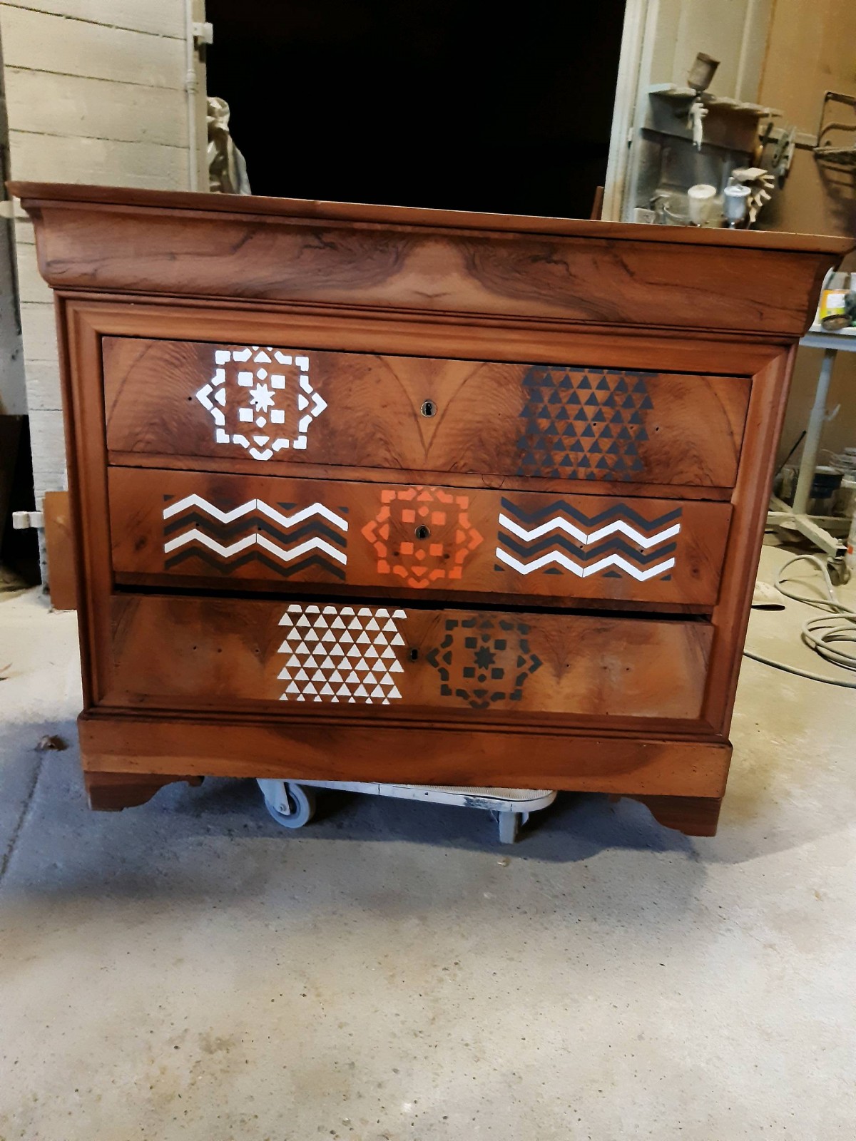 Cette commode ancienne de famille en placage noyer, a été décapée par aérogommage puis a été customisée avec des décorations de style ethniques réalisées à l'aide de pochoirs avec 3 différentes couleurs: le blanc, l'anthracite et le orange pour apporter une petite touche colorée.