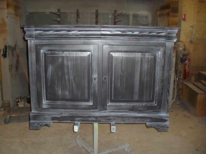 Le décapage de ce buffet a permis de creuser le veinage du bois pour obtenir un effet brossé ce qui permet l'effet cérusé que l'on peut obtenir grâce à ce veinage apparent.