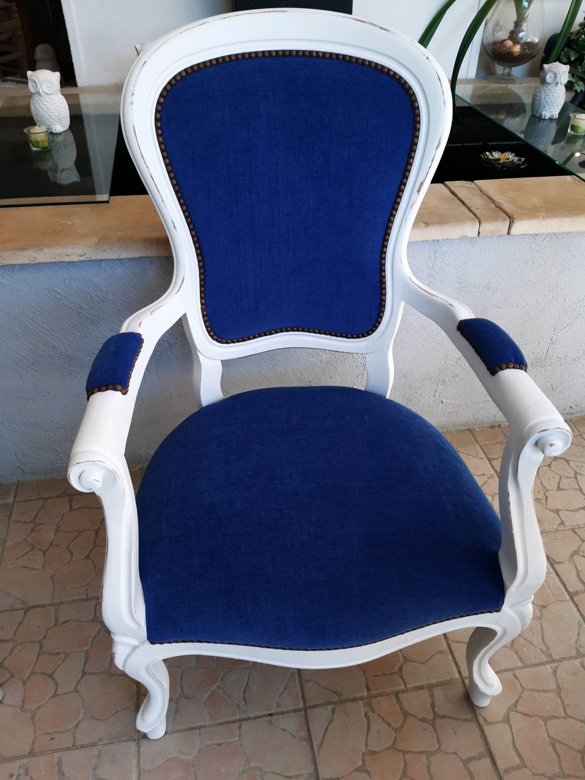 Rénovation de la boiserie et du tissu d'un fauteuil style Louis XV repeint en blanc recouvert d'un tissu bleu anti tâche de la marque "Casal".