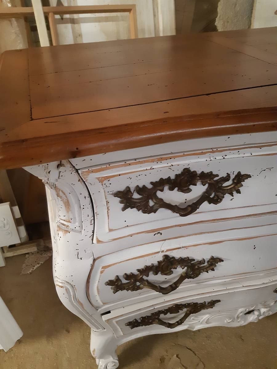 La finition choisie par notre client est une couleur gris clair vieilli pour tout l'ensemble de la commode et le plateau a quant à lui été décapé, puis poncé finement pour ensuite être vernis avec un vernis naturel totalement transparent. Ce vernis de type professionnel que nous avons appliqué sur cette commode ancienne servira à protéger durablement cette commode contre toute les tâches de la vie courante.