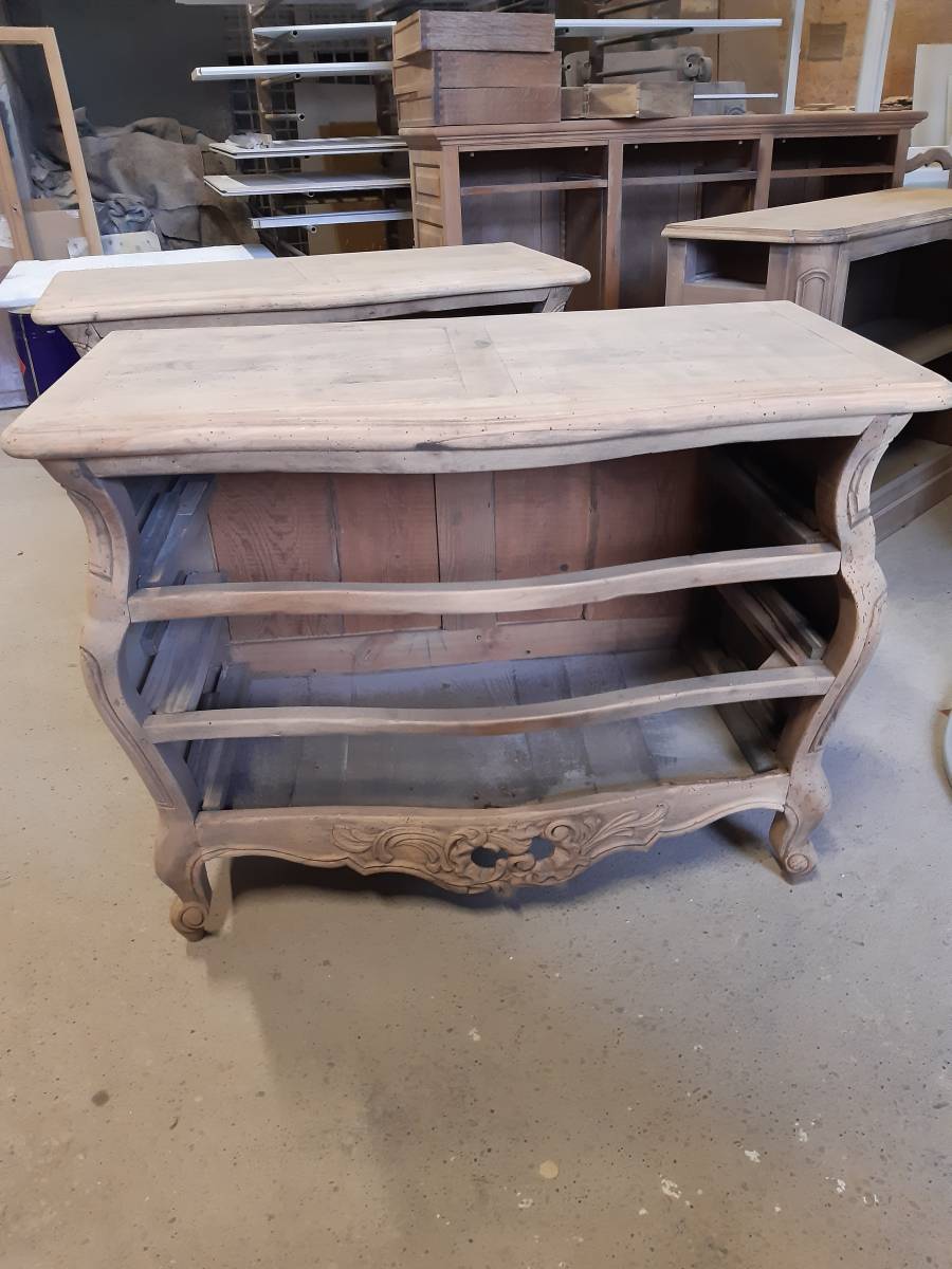 Ce joli meuble relooké et customisé n'est autre q'une commode ancienne galbée en noyer de France fabriquée entièrement à la main par un ébéniste au savoir-faire unique.