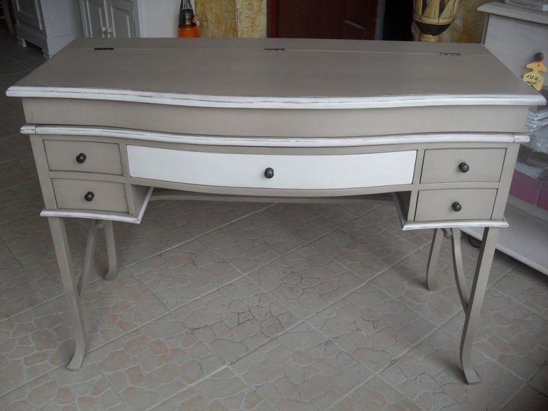 Ce secrétaire a été relooké avec une patine de couleur taupe avec un rechampi blanc grisé légèrement usé.