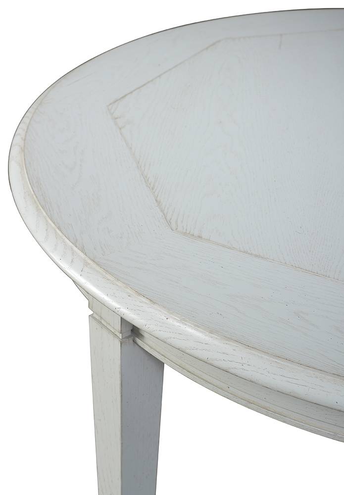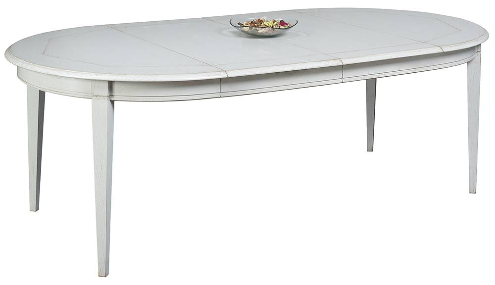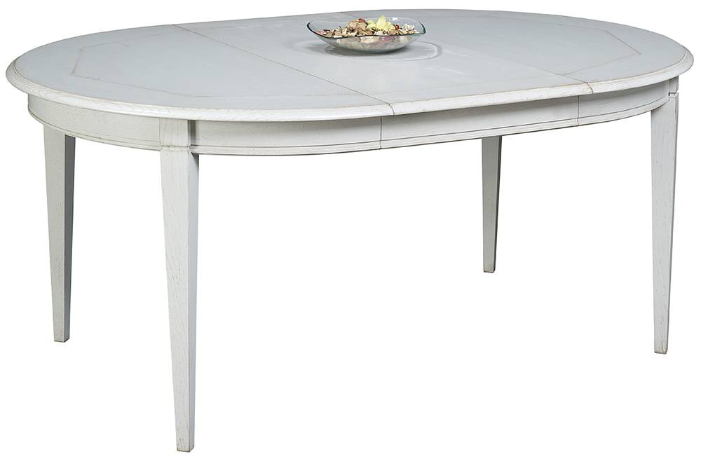 Table ronde dessus panneauté plaqué avec 2 allonges (40 cm chacune) dont une ceinturée.
