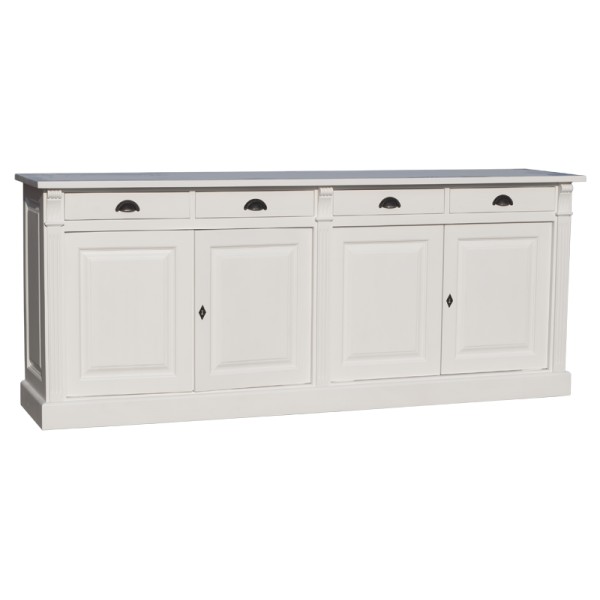 Réalisation du relooking d'un bahut vaisselier en noyer couleur ivoire clair.